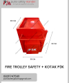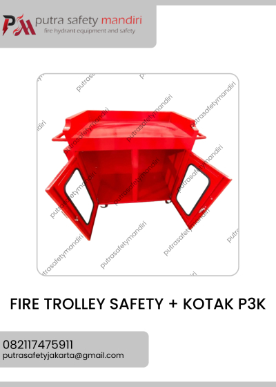 Fire trolley cabinet penyimpanan alat pemadam dengan kotak P3K di bagian samping troli. Troli pemadam ini merupakan solusi praktis untuk penyimpanan alat pemadam kebakaran sekaligus kotak P3K dan perlengkapan evakuasi darurat dalam satu unit yang mobile. Body produk menggunakan plat mild steel 1.2 mm yang tebal dengan pintu kaca 3 mm list karet. Produk ini memiliki 4 roda yang dengan rem dan finishing cat powder coating warna merah.